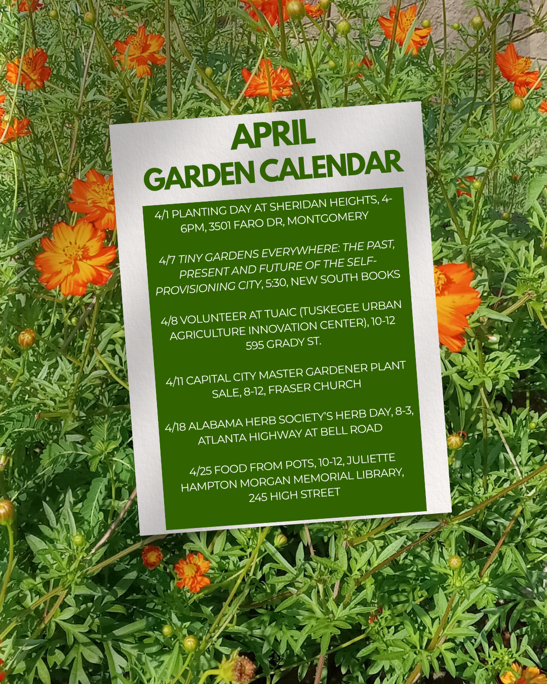 April is such a busy month! (Image: background: green leaves and orange cosmos flowers with green center rectangle listing six garden programs in April.)